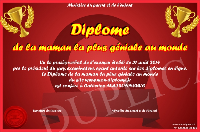 Envoyez par email votre Diplôme de la maman la plus géniale au monde personalisé