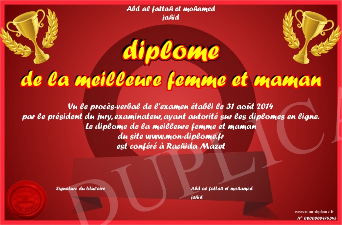 Envoyez par email votre diplôme de la meilleure femme et maman personalisé