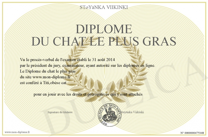 Envoyez par email votre Diplôme du chat le plus gras personalisé