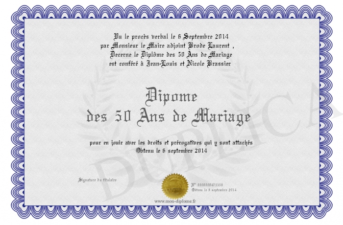 Envoyez par email votre Dipôme des 50 Ans de Mariage personalisé