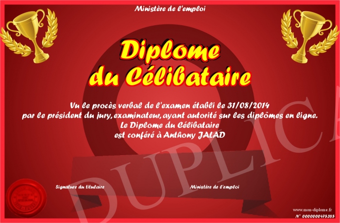Envoyez par email votre Diplôme du Célibataire personalisé