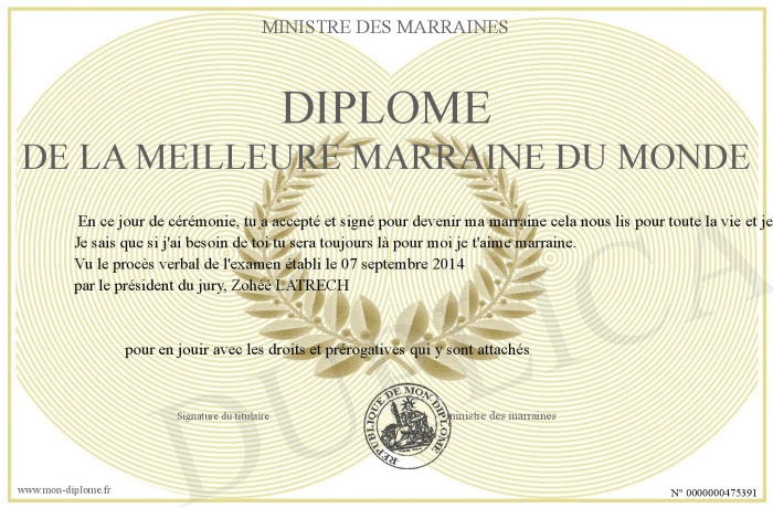 Envoyez par email votre Diplôme de la Meilleure marraine du monde personalisé