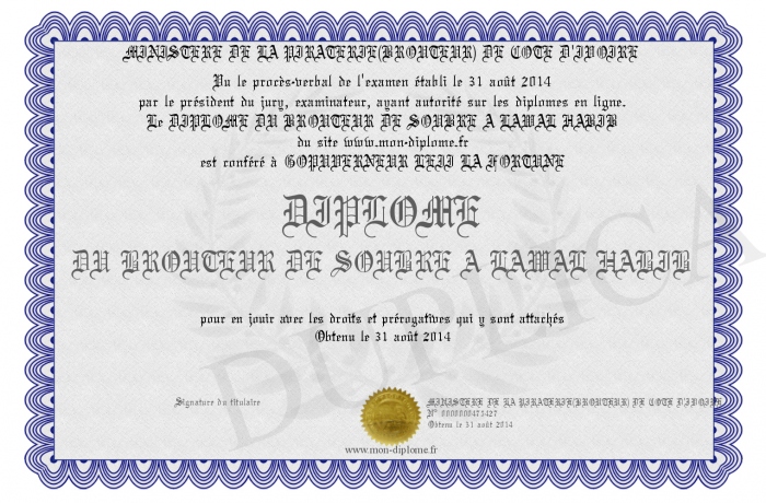 Envoyez par email votre DIPLOME DU BROUTEUR DE SOUBRE A LAWAL HABIB personalisé