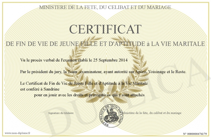 Envoyez par email votre Certificat de fin de vie de jeune fille et d'aptitude à la vie maritale personalisé