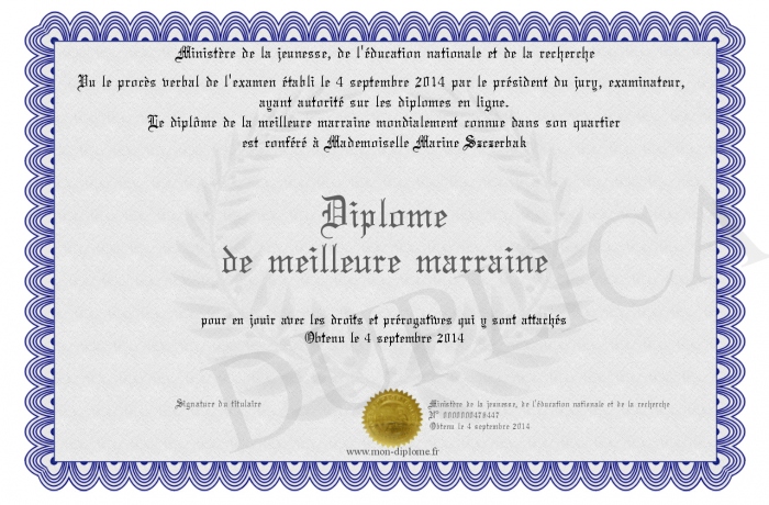 Envoyez par email votre Diplôme de meilleure marraine personalisé