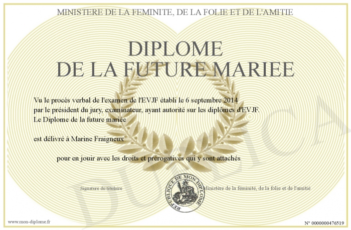 Envoyez par email votre Diplôme de la future mariée personalisé