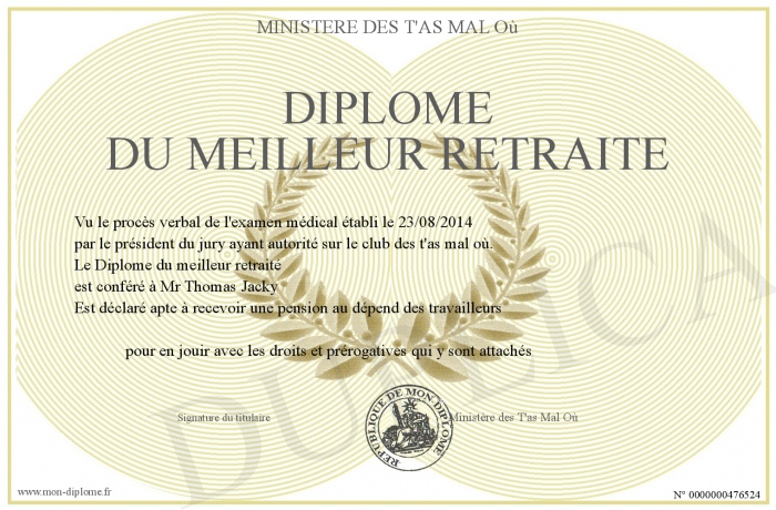 Envoyez par email votre Diplôme du meilleur retraité personalisé