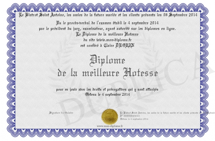 Envoyez par email votre Diplôme de la meilleure Hôtesse personalisé