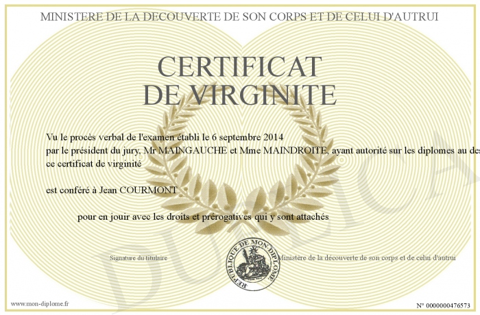 Envoyez par email votre CERTIFICAT DE VIRGINITE personalisé