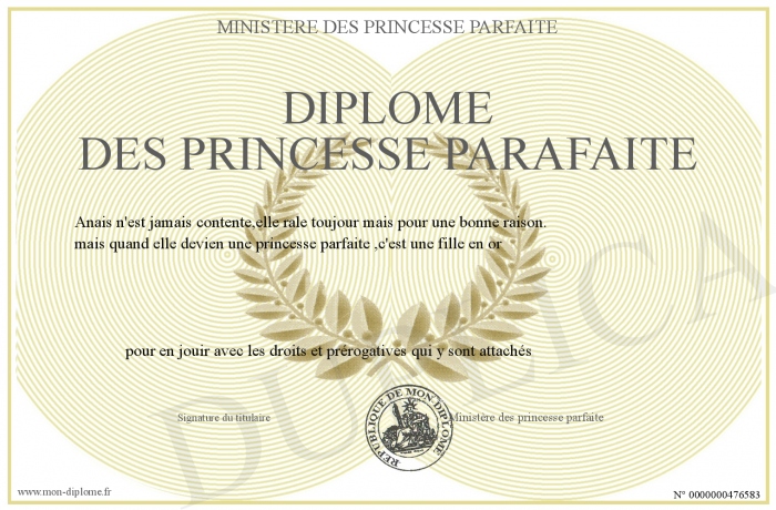 Envoyez par email votre diplome des princesse parafaite personalisé