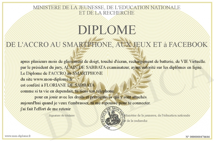 Envoyez par email votre Diplôme de l'Accro au Smartphone, aux Jeux et à Facebook personalisé