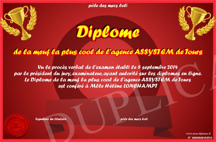 Envoyez par email votre Diplôme de la meuf la plus cool de l'agence ASSYSTEM de Tours personalisé