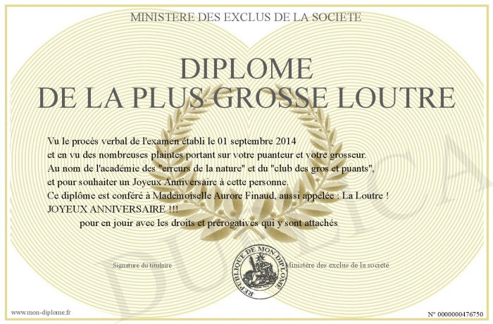 Envoyez par email votre Diplôme de la plus grosse Loutre personalisé