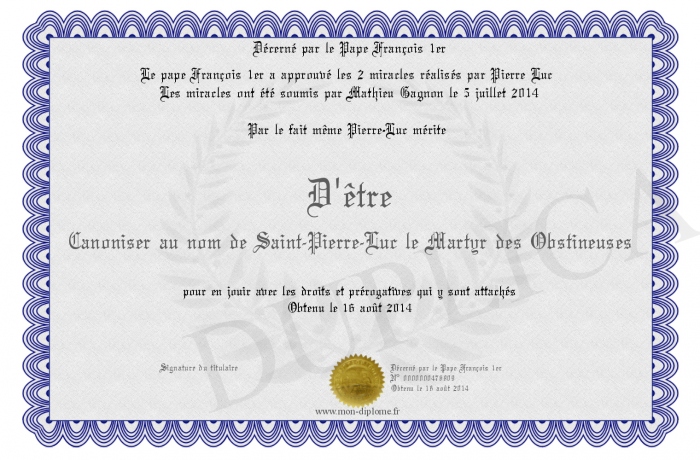 Envoyez par email votre D'être Canoniser au nom de Saint-Pierre-Luc le Martyr des Obstineuses personalisé
