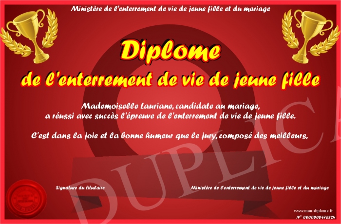 Envoyez par email votre Diplôme de l'enterrement de vie de jeune fille personalisé