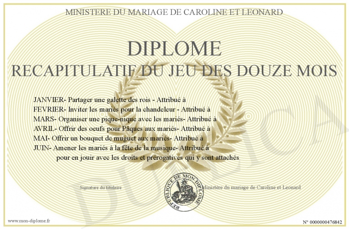 Envoyez par email votre Diplôme récapitulatif du jeu des douze mois personalisé