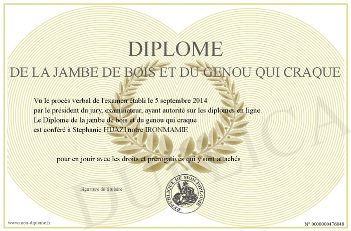 Envoyez par email votre Diplôme de la jambe de bois et du genou qui craque personalisé