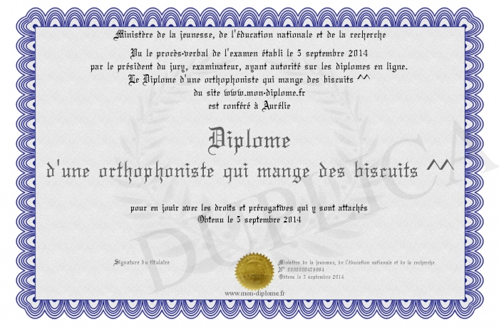 Envoyez par email votre Diplôme d'une orthophoniste qui mange des biscuits ^^ personalisé