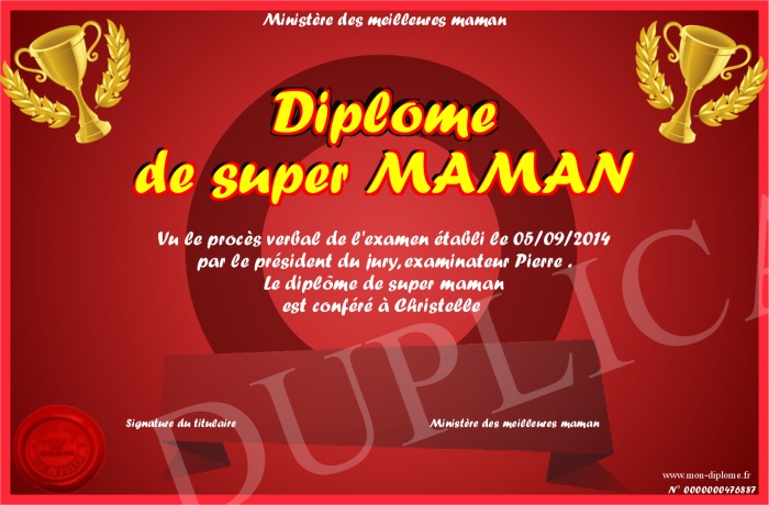 Envoyez par email votre Diplôme de super MAMAN personalisé