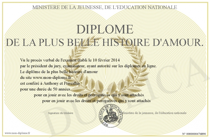 Envoyez par email votre Diplôme de la plus belle histoire d'amour. personalisé