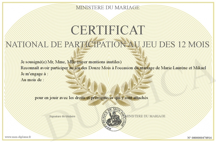 Envoyez par email votre CERTIFICAT NATIONAL DE PARTICIPATION AU JEU DES 12 MOIS personalisé