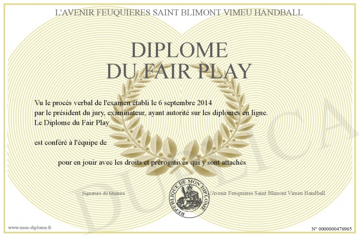 Envoyez par email votre Diplôme du Fair Play personalisé