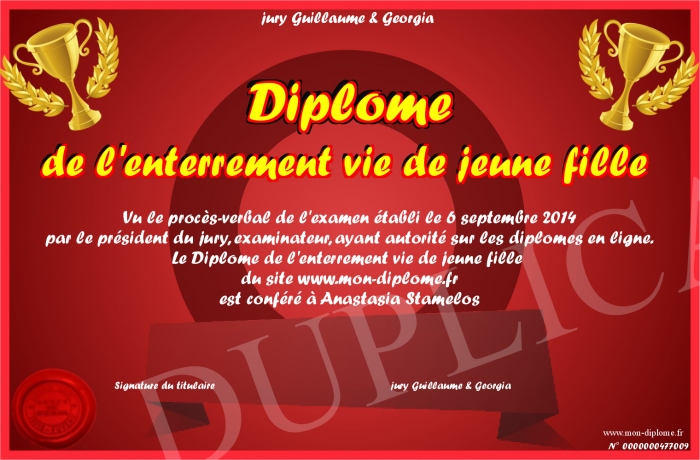 Envoyez par email votre Diplôme de l'enterrement vie de jeune fille personalisé