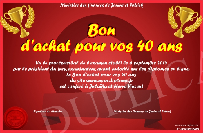 Envoyez par email votre Bon d'achat pour vos 40 ans personalisé