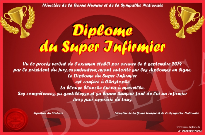 Envoyez par email votre Diplôme du Super Infirmier personalisé