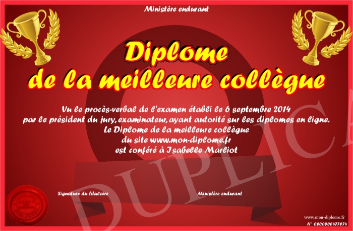 Envoyez par email votre Diplome de la meilleure collègue personalisé