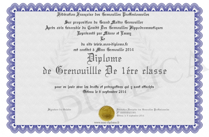 Envoyez par email votre Diplôme de Grenouillle De 1ére classe personalisé