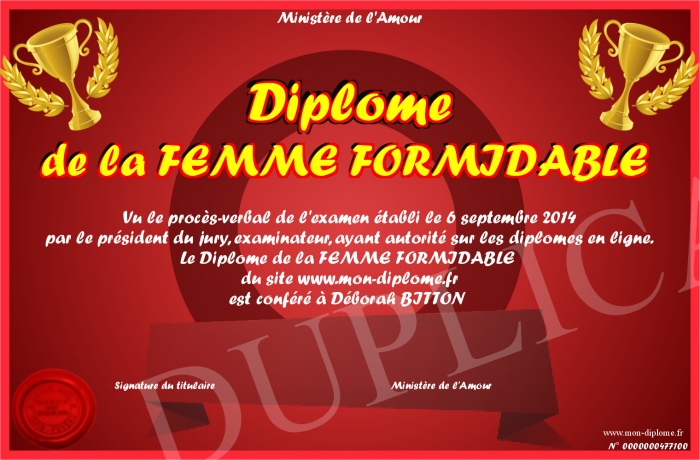 Envoyez par email votre Diplôme de la FEMME FORMIDABLE personalisé