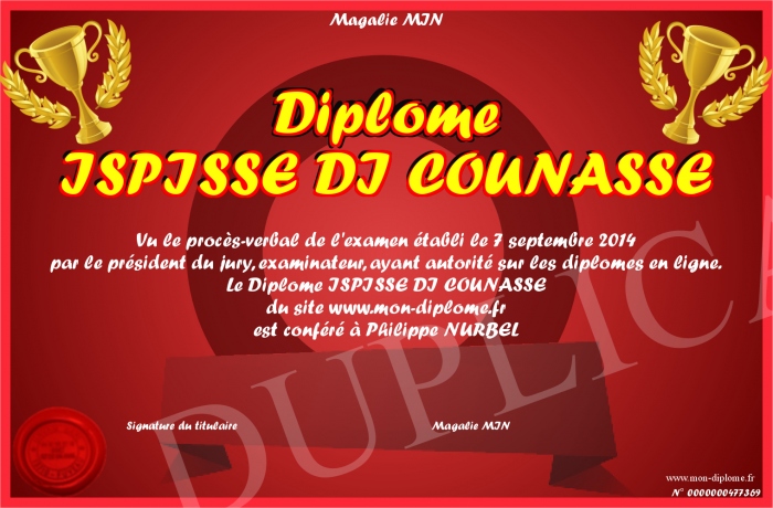Envoyez par email votre Diplôme ISPISSE DI COUNASSE personalisé