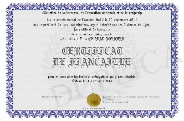 Envoyez par email votre CERTIFICAT DE FIANCAILLE personalisé