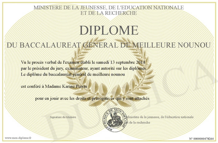 Envoyez par email votre Diplôme du baccalaureat général de meilleure nounou personalisé
