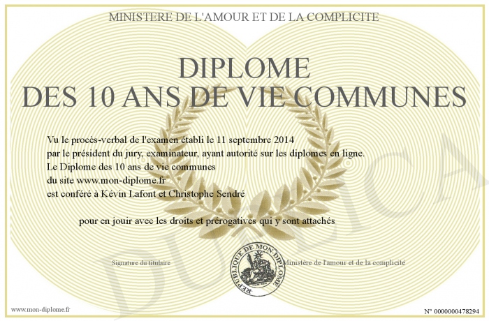 Envoyez par email votre Diplôme des 10 ans de vie communes personalisé
