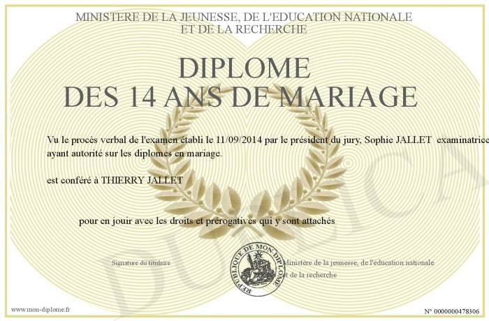 Envoyez par email votre Diplôme des 14 ans de mariage personalisé