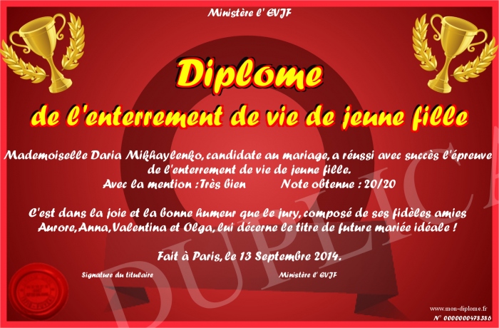 Envoyez par email votre Diplôme de l'enterrement de vie de jeune fille personalisé