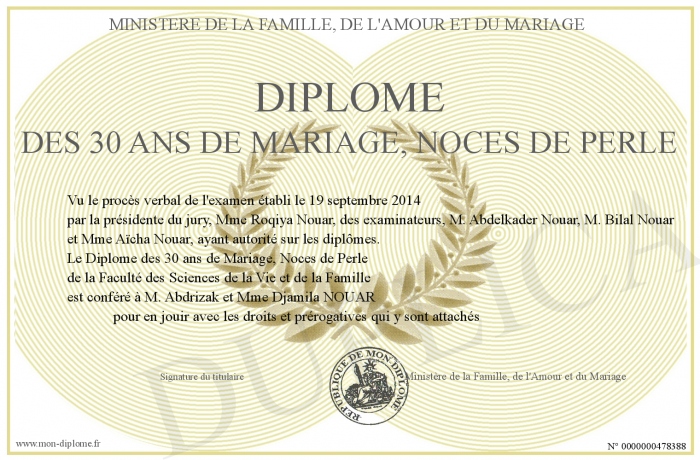 Envoyez par email votre Diplôme des 30 ans de Mariage, Noces de Perle personalisé
