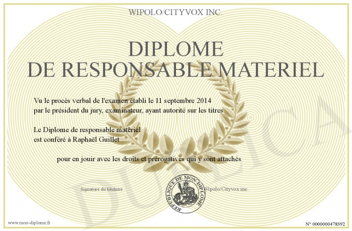 Envoyez par email votre Diplôme de responsable matèriel personalisé