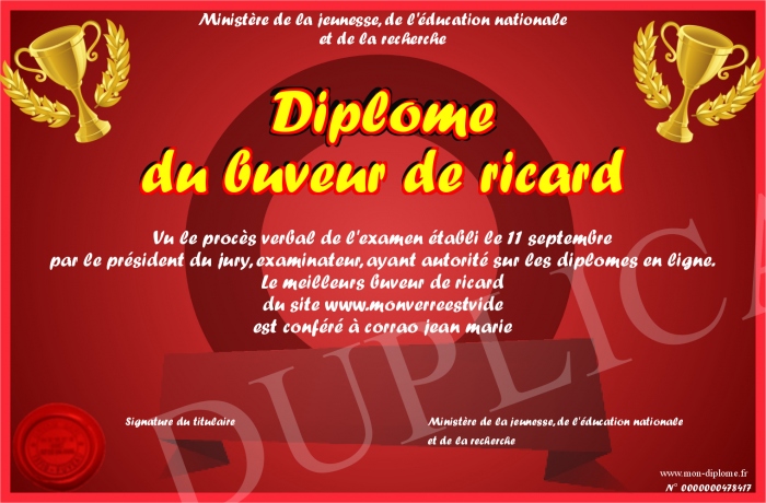 Envoyez par email votre Diplôme du buveur de ricard personalisé