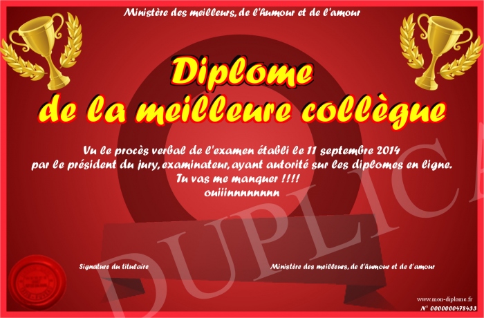 Envoyez par email votre Diplome de la meilleure collègue personalisé