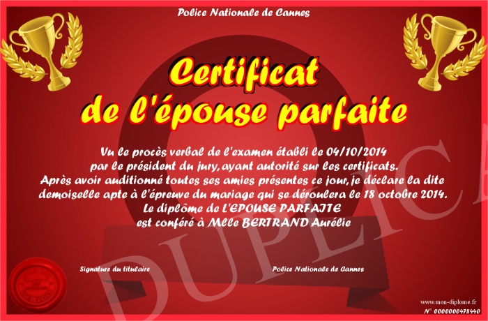 Envoyez par email votre Certificat de l'épouse parfaite personalisé