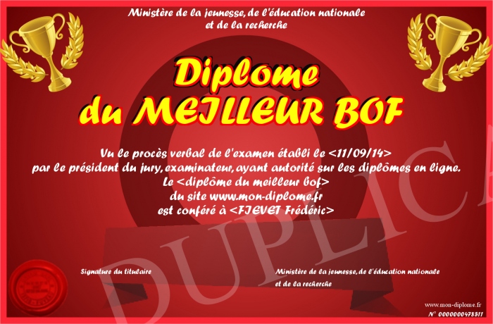 Envoyez par email votre Diplôme du MEILLEUR BOF personalisé