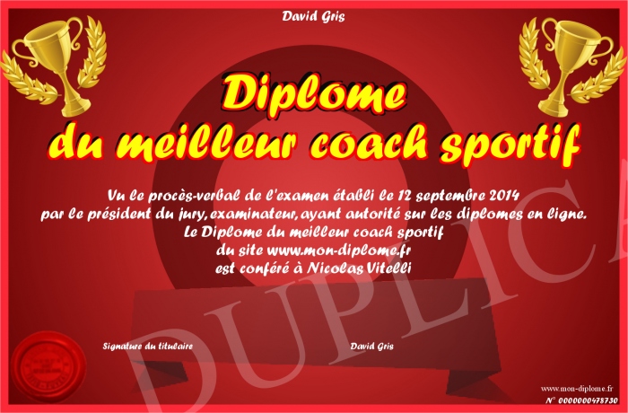 Envoyez par email votre Diplôme du meilleur coach sportif personalisé
