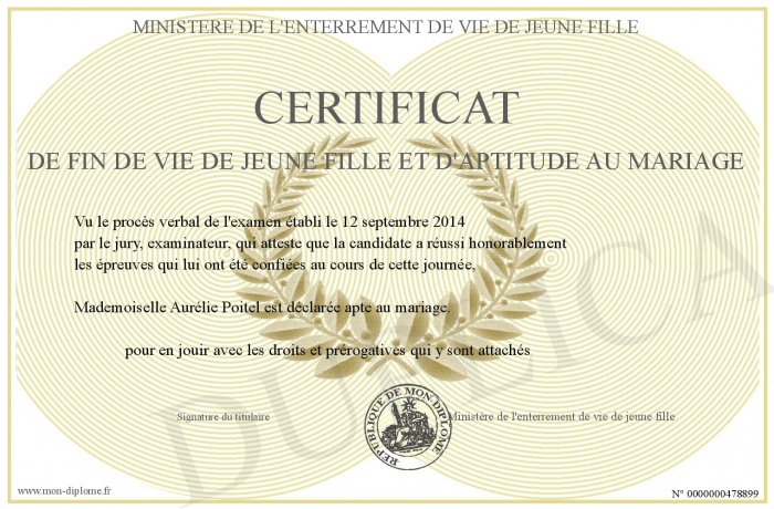Envoyez par email votre Certificat de fin de vie de jeune fille et d'aptitude au mariage personalisé