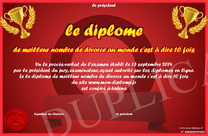 Envoyez par email votre le diplome de meilleur nombre de divorce au monde c'est à dire 10 fois personalisé