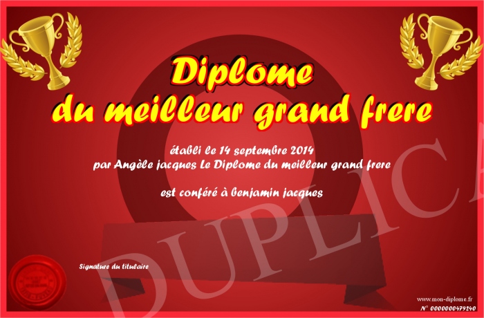 Envoyez par email votre Diplôme du meilleur grand frere personalisé