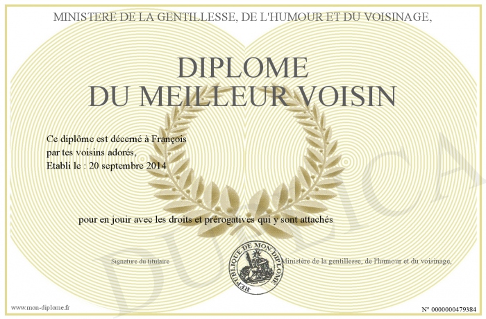 Envoyez par email votre Diplôme du Meilleur Voisin personalisé
