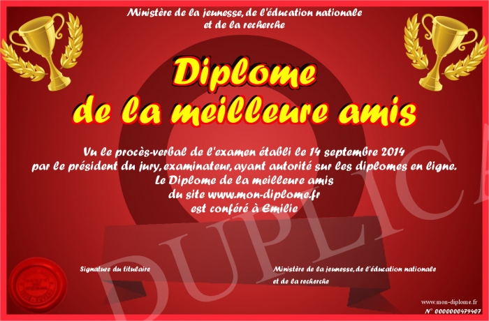 Envoyez par email votre Diplôme de la meilleure amis personalisé